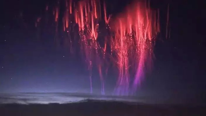 A spectacular display of more than one hundred "red sprite" lightning events was captured above the Himalayas in Tibet. These rare, upward-shooting electrical discharges, occurring high above thunderstorms, were observed near Pumoyongcuo Lake on the southern Tibetan Plateau. pic.twitter.com/N4HUNZdP6W