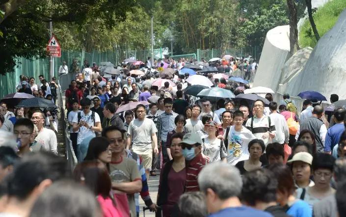 粉嶺港鐵站外,大批市民排隊等候巴士到和合石墳場,出現人龍。