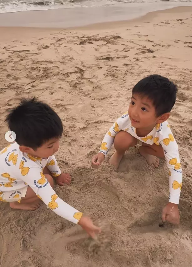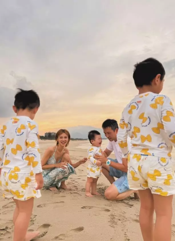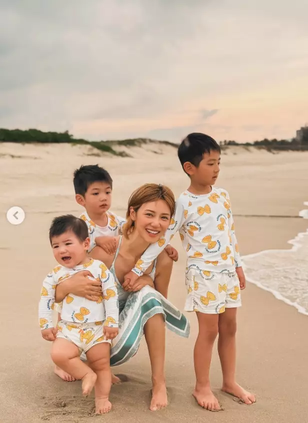 Elva今次旅程相當悠閒,每日行程包括做水療、泳池邊歎早餐、充足睡眠兼品嚐美食,完全放鬆充電。她亦不吝分享泳照,身穿泳衣大騷修長美腿及勻稱身材,狀態弗爆,完全看不出已是三孩之母。其中一張相片,她「一拖三」與兒子們在沙灘合影,三位小朋友穿上同款兄弟裝,可愛度爆錶!不過,年紀最細的細仔卻突然「扭計」,拍照期間嚎啕大哭,拒絕配合,最後要出動爸爸抱抱安慰,場面搞笑又溫馨。