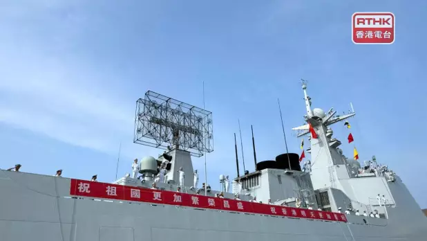 湛江艦掛上「祝祖國更加繁榮昌盛 祝香港明天更加美好」橫幅。(陳曉筠攝)