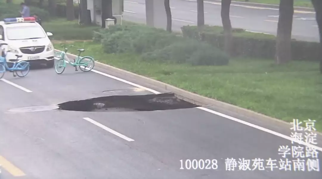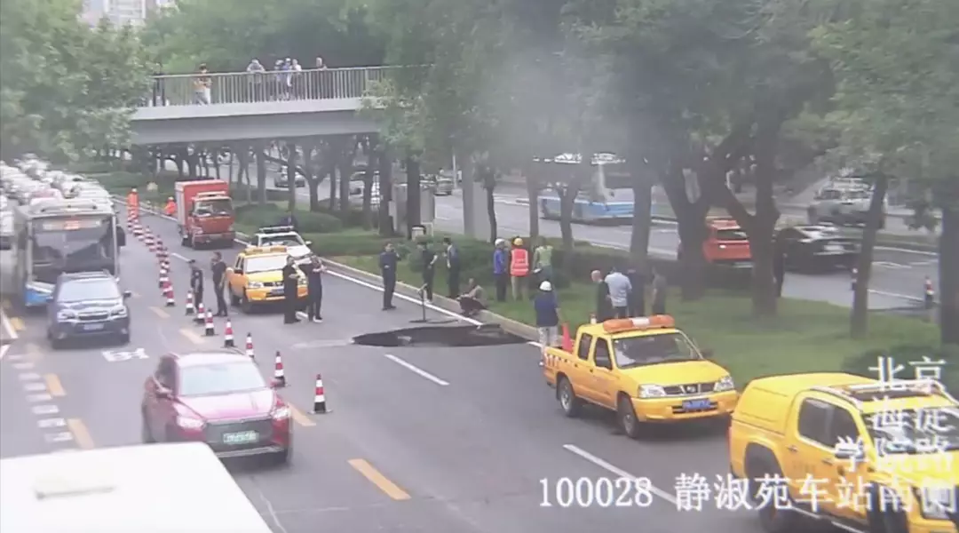 綜合內媒報導,北京海淀區學清路靜淑苑巴士站附近南向北方向內側車道於6月26日清晨突然發生路面塌陷事件,現場路面出現直徑約2米的深坑,多輛經過車輛險些陷入其中,所幸緊急剎車才避過一劫。