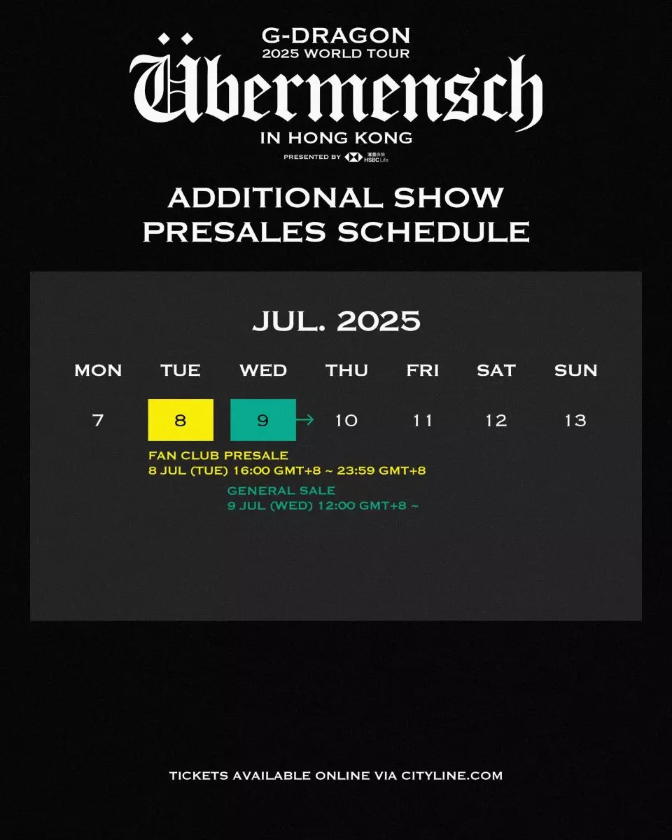 韓流天王G-DRAGON(GD,權志龍)強勢回歸,其《G-DRAGON 2025 WORLD TOUR [Übermensch] IN HONG KONG》將於2025年8月9日至8月10日在香港亞洲國際博覽館Arena舉行,原定兩場門票於上周一6月30日公開發售,然而,公開發售僅半小時內門票已全數售罄,粉絲熱情空前。因應樂迷的熱烈要求,主辦方正式宣布加開一場演出,定於8月8日星期五晚舉行,為香港「FAMs」(G-DRAGON粉絲稱呼)帶來更多欣賞偶像演出的機會,本次一共三場的巡演勢必掀起全城熱潮。