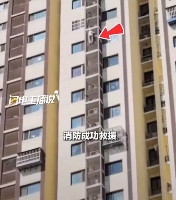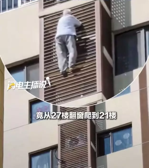 北京一名89歲老婦疑被反鎖房內翻窗求生,由27樓沿外牆爬至21樓體力不支懸空,20分鐘後獲消防架通道救回脫險。