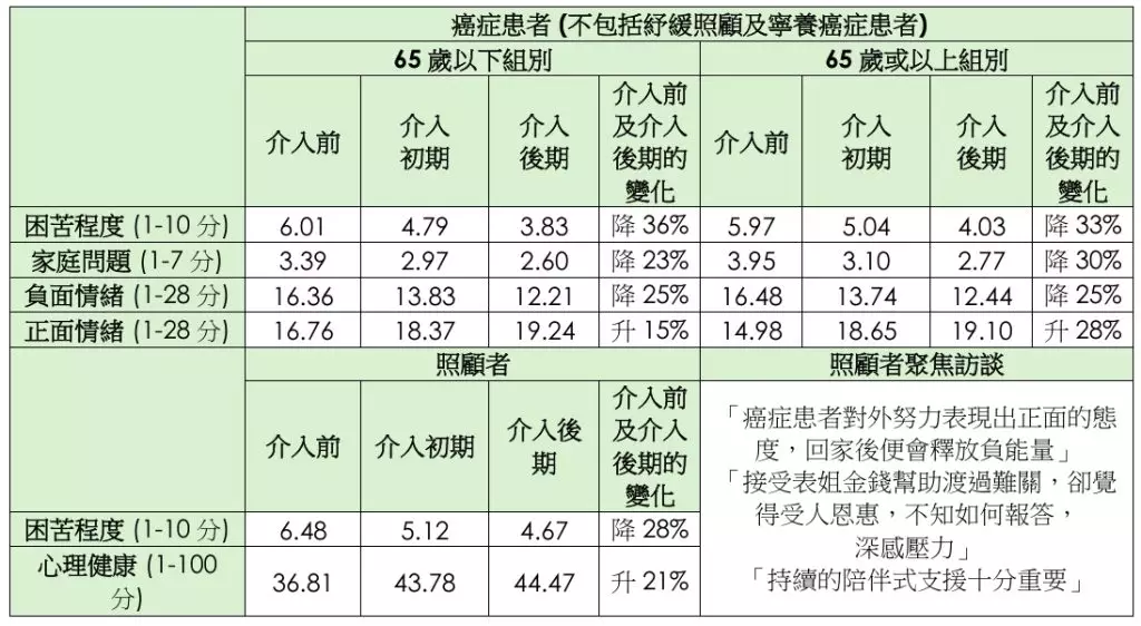 研究團隊指出,癌症患者普遍在確診時感到焦慮無助,擔心會為他人帶來負擔而避免求助,故此介入前基線評分略低(相比外國研究)。在介入初期,參與者已顯著改善困苦程度及家庭問題。及至介入後期,參與者透過身心靈輔導等,學習釋放情緒壓力,改善幅度雖然未及介入初期,仍屬數據上有顯著改善。另外,在聚焦訪談中,有照顧者反映持續的陪伴式支援十分重要,相信是由於華人並不習慣向人求助及講述自身問題,故需較長時間與他人建立信任關係。