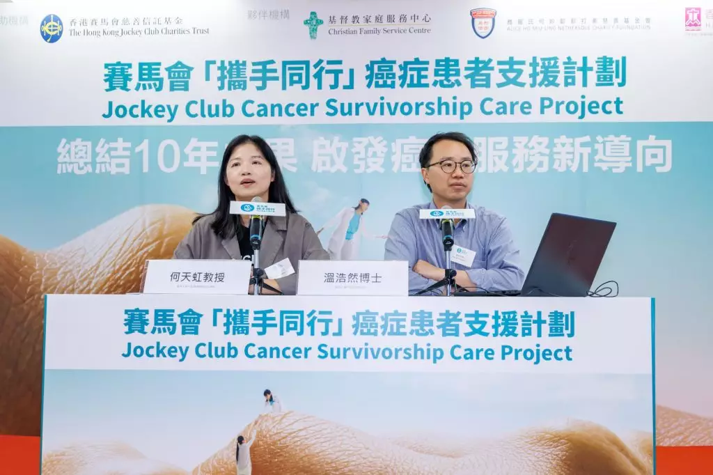 賽馬會「攜手同行」癌症患者支援計劃研究項目負責人、香港大學行為健康教研中心總監何天虹教授(左)總結:「研究結果顯示,全面及早介入可大幅改善患者的困苦程度、精神健康及減少家庭問題,也有助改善照顧者的情緒。