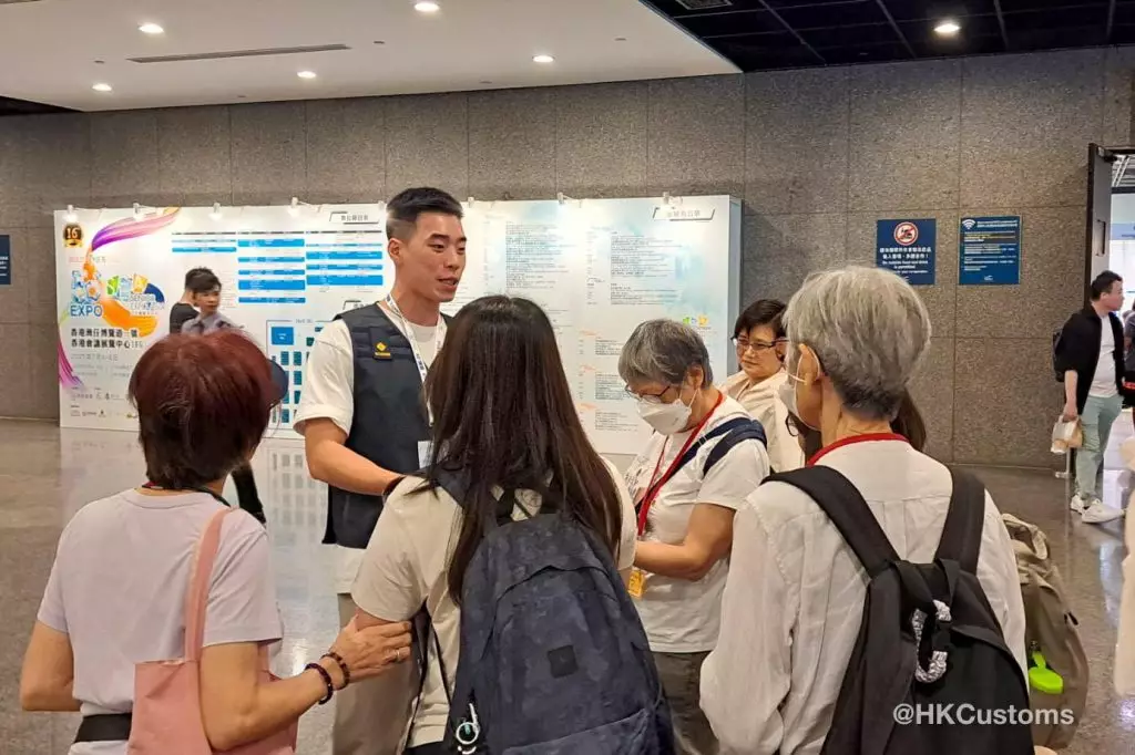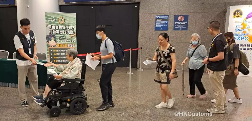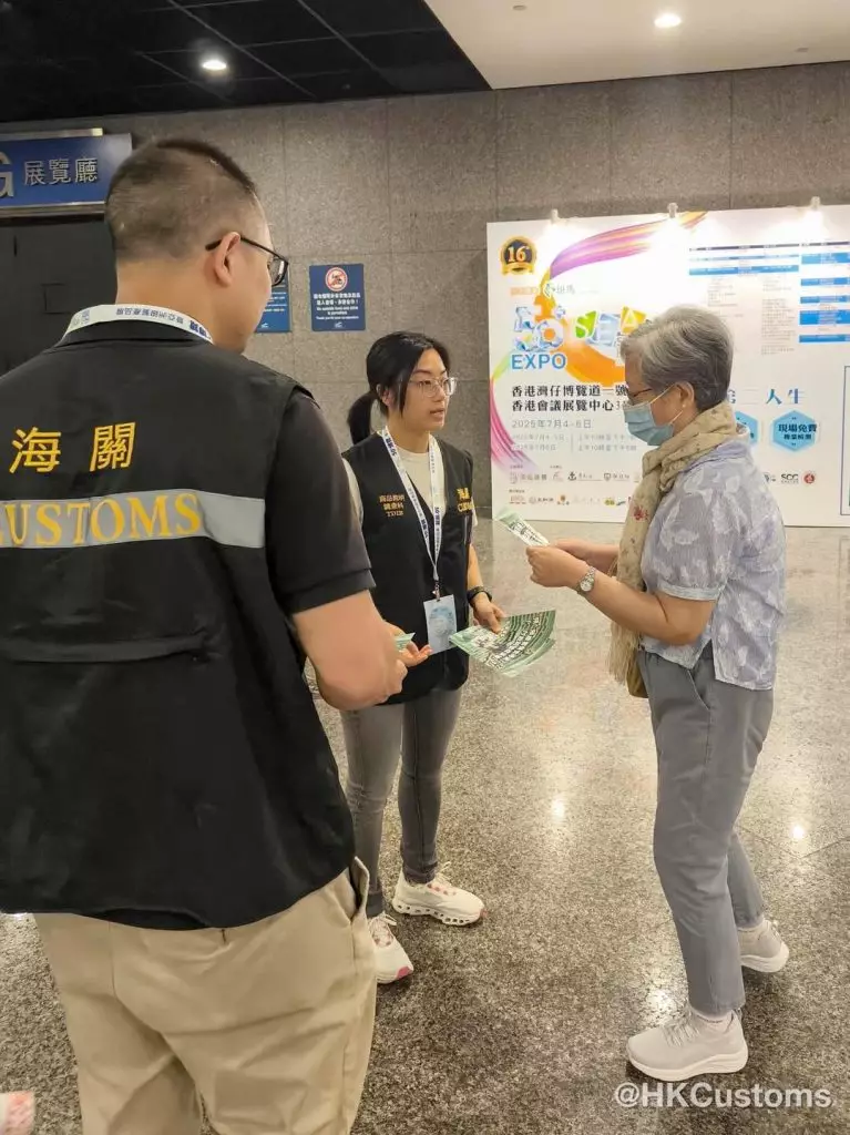 海關宣傳隊於剛過去周末(7月4日至7月6日)再次出動 ,到會展中心向參與「 50+博覽暨亞洲銀髮產品展 」的市民派發宣傳單張 ,提醒消費者在購買預繳套餐要「諗清楚」 。