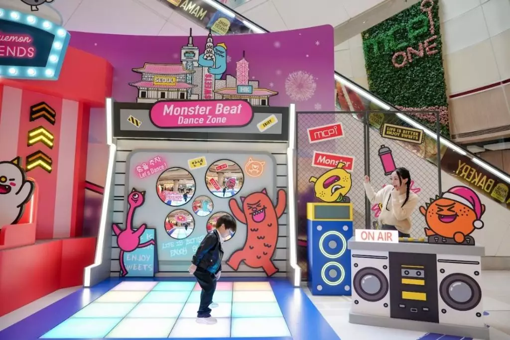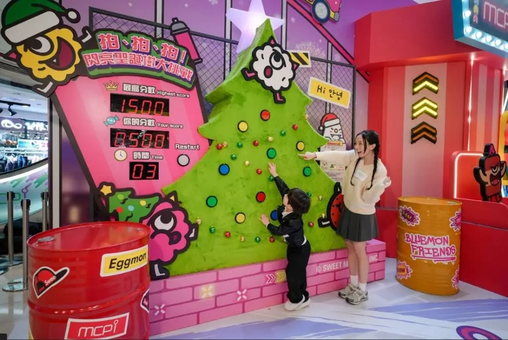 MCPOne 以標誌性遊樂場設施「跳樓機」為主題打卡點,顧客走進裝置裡與Sweet Monster朋友們一起體驗極限遊樂設施,定格錯覺設計,模擬身處高空急速下墜的瞬間,感受極速俯衝的刺激快感!而旁邊的毛毛聖誕樹,毛茸茸的質感既溫暖又吸睛。玩累了?不妨投入 Monster Beat DJ 音樂派對,踏上繽紛閃爍的dancing floor,腳踩地板,燈光會隨著節奏即時亮起,創造出炫目光影效果,讓你盡情釋放無限活力!此外,MCPOne更為社交媒體達人打造多組趣味「魚眼鏡」及街頭塗鴉風格打卡牆。魚眼鏡誇張變形效果為自拍注入強烈玩味;再搭配街頭風格背景,完美呈現 Sweet Monster 的「型」格態度,輕鬆拍出最具個性的聖誕開心Moment!