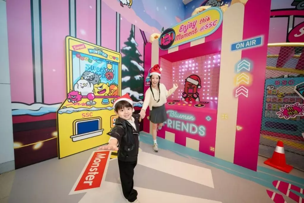SSC則以充滿速度感與動感視覺的「Sweet Monster雲霄飛車」主題裝置迎接大家!Bluemon 與朋友帶領各位於這座潮酷有型的聖誕雲霄飛車打卡,絕對是情侶與家庭合照首選熱點!場內另一焦點裝置「3米高巨型爆谷DJ Station」,設計靈感源自遊樂場經典小食「爆谷」,造型搶眼奪目;裝置內設有互動按鈕,牆身燈效會隨著按動而變化,猶如爆谷的香甜氣息在空中綻放!除此之外,還可到「Bluemon 毛毛鏡子」前拍照,這座充滿著街頭藝術感的藍色毛毛外框巨型鏡子,鏡面折射出多角度的趣味倒影,為閨蜜、老best或情侶們提供型格互動場景,拍出獨一無二、鬼馬玩味的照片。最後別忘在「心心交通燈」打卡裝置拍照留念 -- 來自日常街頭交通燈,巧妙地把紅綠燈換成可愛心形圖案,打造夢幻又浪漫的街景。無論是自拍還是拍攝帶有故事情節的節日短片,為冬日留下溫馨一刻!