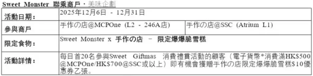 除了「超好拍」打卡裝置外,兩大商場亦精心準備一系列互動活動與消費禮遇,讓顧客盡情歡度佳節!於MCPOne 及 SSC以電子消費滿 HK$50 或以上,即可參加「拍、拍、拍!閃亮聖誕樹大挑戰」,眼明手快完成遊戲,即有機會贏取豐富獎品!「Sweet Giftmas 消費禮賞」 為大家送上甜蜜又實用的獨家限定禮品,顧客只須消費滿指定金額,即有機會把 SWEET MONSTER 旅行毛巾套裝及隨行攪拌杯等聖誕好禮帶回家,送禮或自用同樣適合。活動期間的指定週末,商場將舉行「Monster Beat DJ 音樂派對,由專業DJ 現場打碟,精選播放Chill & Festive music,顧客邊逛邊聽好音樂,感受滿滿聖誕氛圍!聖誕檔期當然少不了人氣主角 Bluemon 驚喜現身商場!顧客只需以電子消費滿 HK$50 或以上,即可參與 「Photo Day - Blue Mon 聖誕見面會!」,與藍色型格萌主Bluemon合照,並獲贈極具紀念價值的即影即有乙張。作為韓國甜品品牌的 Sweet Monster 難得再度登陸香港,今次更特意配合聖誕檔期,crossover商場租戶「手作の店」推出節日限定「爆爆脆雪糕」,香滑雲呢拿雪糕配上香脆濃郁焦糖爆谷,為顧客味蕾帶來今個聖誕限定的甜蜜滋味。