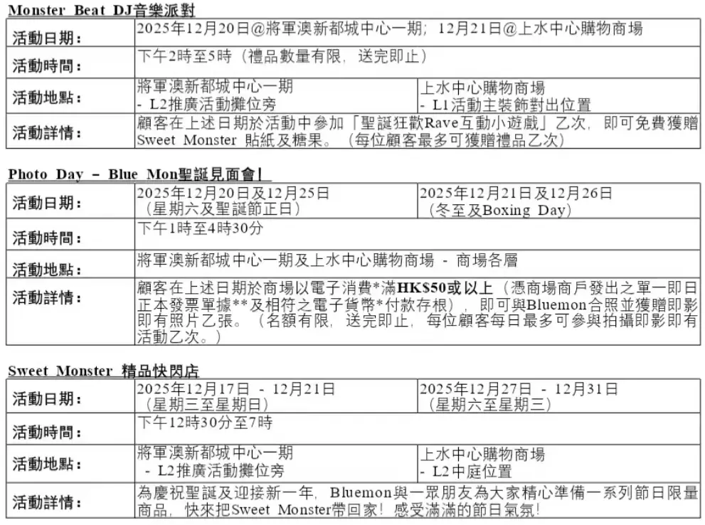 是次活動精心策劃多個特色打卡場景及互動遊戲,包括刺激好玩的「拍、拍、拍!閃亮聖誕樹大挑戰」,與潮萌主角Bluemon近距離互動,以及超Chill DJ音樂派對。場內更特設Sweet Monster精品快閃店,發售獨家限定禮品;以及聯同美食商戶炮製限定甜品。這場集「打卡、食、玩、買」於一身的聖誕嘉年華,從場景裝置、互動體驗、獨家禮品到美食企劃,全方位展現Sweet Monster攪鬼趣怪的獨特魅力。現誠邀大家與摯愛親朋蒞臨參與,一同沉浸於最潮最甜的節日氛圍!
