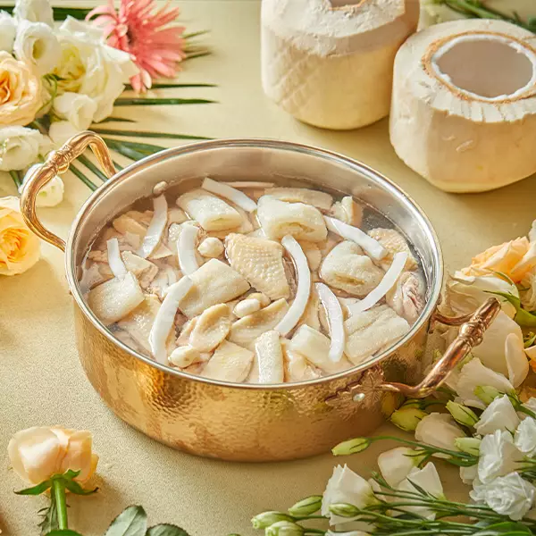 另一招牌「鳳園雞煲」(HK$199/半隻雞、HK$298/整隻雞)選用鮮嫩的文昌雞,配以秘製「鳳園醬汁」爆炒,醬汁濃郁鮮香,更可「一煲兩食」——先品嚐雞件後,加入每日鮮熬的高湯,即可變身火鍋,涮煮生蠔、鮑魚或掛汁力強的華豐麵,一鍋盡享雙重滋味。鎮店招牌「竹笙椰子雞煲」(HK$258/半隻雞、HK$358/整隻雞)則現場在客人席前倒入原隻進口泰國椰青,視覺效果震撼,湯底保留百分百新鮮清甜,與嫩滑文昌雞、爽口竹笙搭配,每一口都是純粹鮮甜。