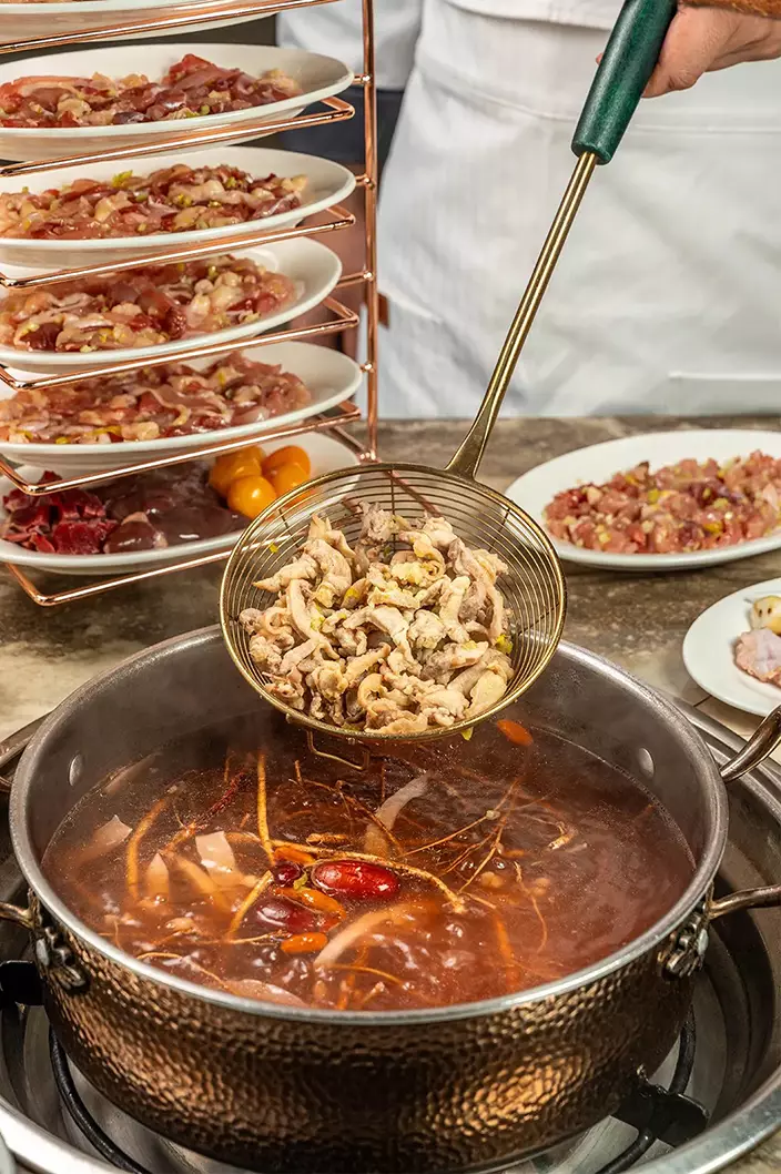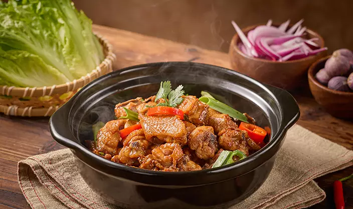 餐廳主打全港首創的「五指毛桃脆皮雞煲」及「橄欖脆皮雞煲」,選用養足30天的果園雞,肉質緊實爽脆,雞味濃郁。經獨特烹調工藝製成的脆皮雞,外皮爽脆,內裡肉汁豐腴。其中五指毛桃脆皮雞煲(HK$228/份)配搭廣東人熟悉的袪濕養生藥膳「五指毛桃」,湯底由後廚每日新鮮熬製,上桌時已是十足火候,醇厚甘甜;橄欖脆皮雞煲(HK$228/份)則以清潤的潮汕橄欖入湯,具有清熱下火、生津消炎的功效,湯色清澈,入口回甘。