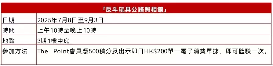 可曾想過在「反斗奇兵」經典場景跟玩具老友記同框自拍?活動期間,新城市廣場3期1樓設立「反斗玩具公路照相館」,超級搶眼的自拍亭本身已是一道打卡風景,還有多款30周年期間限定相框,足夠讓您回憶每段電影情節!