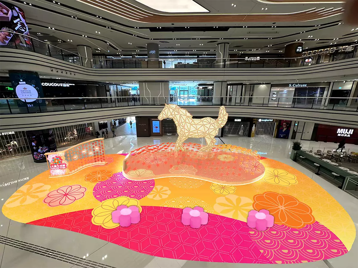 適逢馬年將至,為迎接甲午新春,在沙田區成長的本地知名建築師蕭國健特別匠心打造六米高「駿馬」藝術裝置。駿馬身型矯健,由超過 500 個三角幾何形狀拼合而成,每一片三角構件均鏤刻「福」字通花紋樣,整件作品共綴以超過 2800 個福字,寓意福澤綿延、萬福臨門。藝術裝置特意將馬首朝向流年風水旺位——東北方,取「馬首是瞻」之勢,寄寓新一年馬到功成、事事亨通。