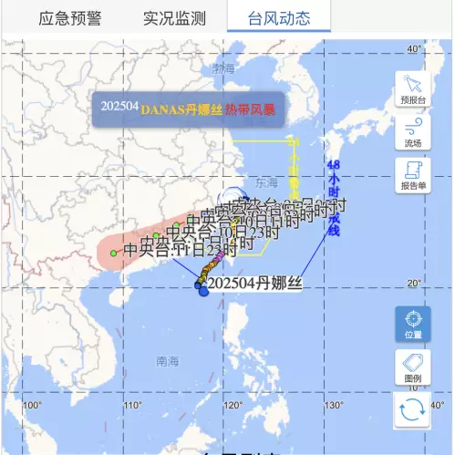 風暴丹娜絲晚上9時許以熱帶風暴級別,在浙江省溫州市洞頭區沿海再次登陸,登陸時中心附近最大風力9級。