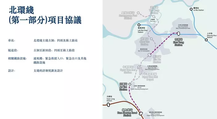 港鐵發言人表示,今次簽訂的項目協議,跟以往構思最大的不同在於北環綫的主綫和支綫整合為單一項目,但將分為兩部分進行施工,先開展第一部分項目協議的建造工程,包括主線的古洞、凹頭、錦上路站;連接古洞至新田段、凹頭至錦上路段的隧道段,以及相關鐵路設施如通風樓、緊急救援入口等;並同步進行支綫的詳細規劃和設計。
