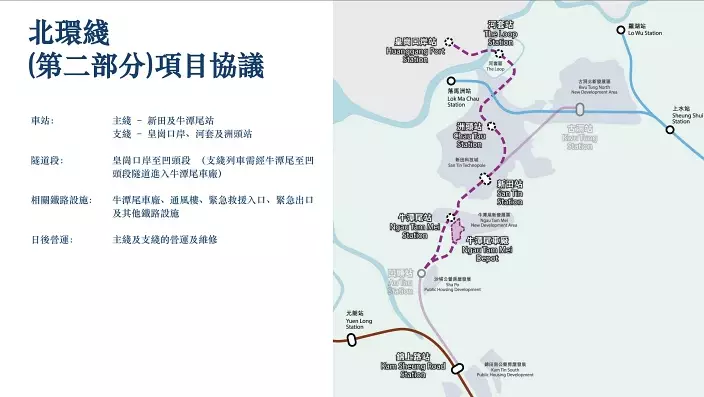 至於主綫餘下的部分工程包括新田及牛潭尾站,以及支綫的各個車站,包括皇崗口岸、河套及洲頭站;皇崗口岸至凹頭的隧道段,需同時支持主綫與支綫的牛潭尾車廠等相關鐵路設施,則會在第二部分的項目協議才一併處理。