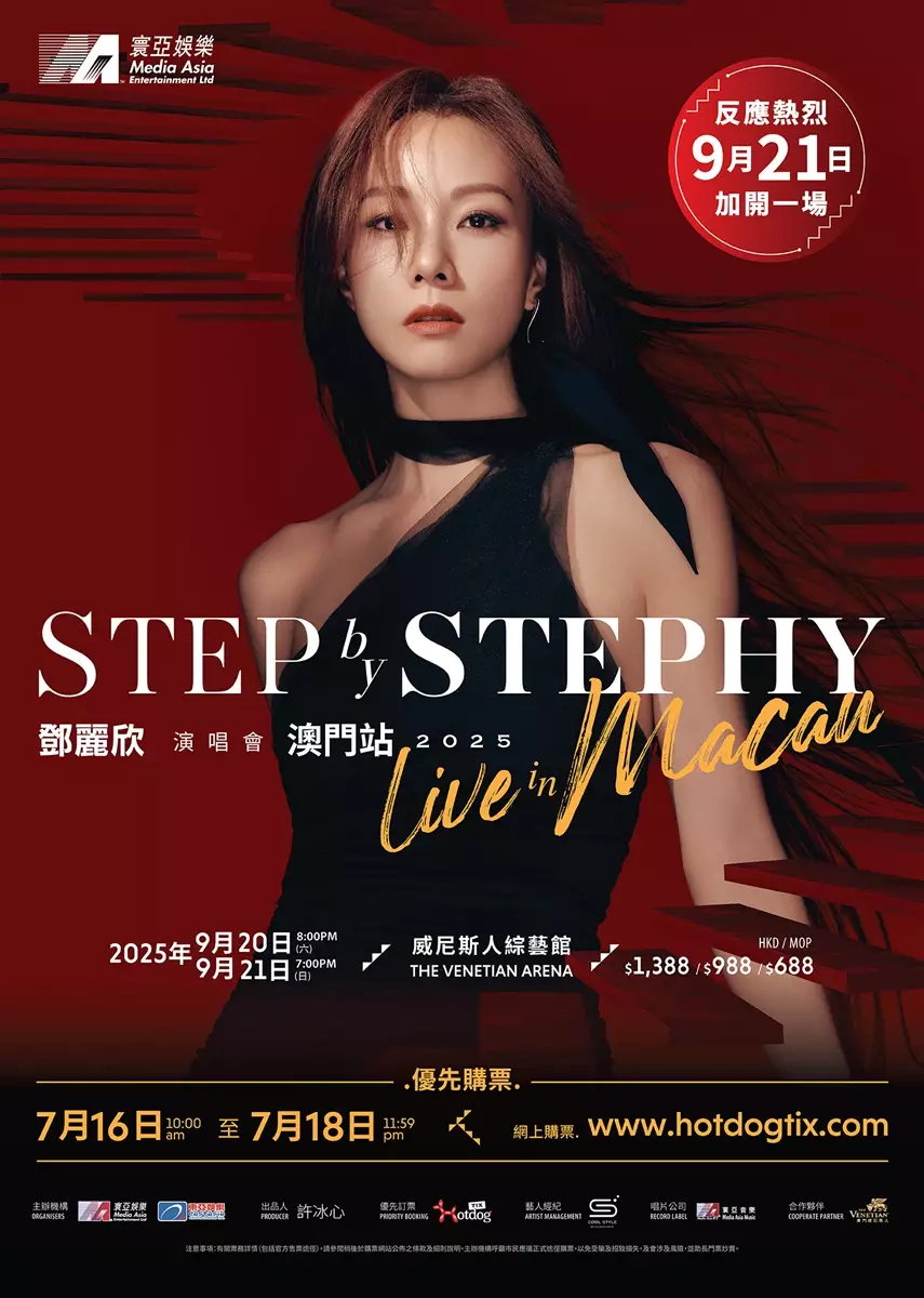 《STEP by STEPHY鄧麗欣演唱會澳門站2025》前天優先訂票火速秒殺,門票尚未公開發售,Stephy驚喜宣佈加開9月21日一場,優先購票將於本月16號於 www.hotdogtix.com 或 HotdogTIX手機應用程式發售,而公售日期將稍後公布。Stephy說:「今年3月香港演唱會得到歌迷嘅喜愛並且能夠移師到澳門演出,真係十分開心同感恩。上次做足200分,今次我要做到300分!上次無敵風火輪打咗2個圈,今次會唔會挑戰3個呢?哈哈……大家拭目以待!目前要為澳門演唱會同拉闊騷做好準備,身體健康係最緊要,而家開始要保養吓身體,要注重飲食、休息同運動,保持自己體態。」