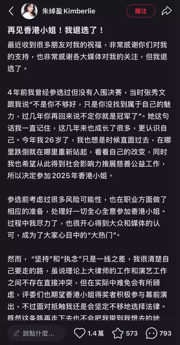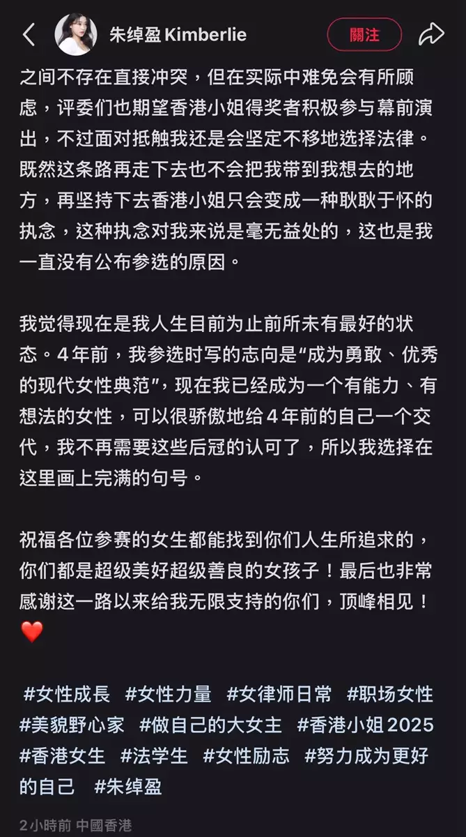 最近收到很多朋友對我的祝福,非常感謝你們對我的支持,也非常感谢各大媒體對我的關注 ,但我退選了。 4年前我曾經參選過但沒有入圍决賽,當時張秀文跟我說:「不是你不夠好,只是你沒找到屬於自己的魅力,過幾年你再回來,說不定你就是冠軍了。」她這句話我一直記住,這幾年來也成長了很多,更認識自己。今年我26歲了,我也想是時候直面過去,在哪裡跌倒就在哪裡重新站起,看看自己的改變,同時我也希望從此得到社會影響力推展慈善公益工作,所以決定參加2025年香港小姐。 參選前考慮過很多風險可能性,也在職業方面做了相應的準備,處理好一切全心全意參加香港小姐。過程中我盡力了,也很開心得到大眾和媒體的認可,成為了大家心目中的「大熱門」。 然而,「堅持」和「執念」只是一線之差,我很清楚自己要走的路,雖說理論上大律師的工作和演藝工作之間不存在直接衝突,但在實際中難免會有所顧慮,評委們也期望香港小姐得獎者積極參與幕前演出,不過面對抵觸我還是會堅定不移地選擇法律。既然這條路再走下去也不會把我帶到我想去的地方,再堅持下去香港小姐只會變成一種耿耿於懷的執念,這種執念對我來說是毫無益處的,這也是我一直沒有公布參選的原因。 我覺得現在是我人生目前為止前所未有最好的狀態。4年前,我參選時寫的志向是「成為勇敢、優秀的現代女性典範」,現在我已經成為一個有能力、有想法的女性,可以很驕傲地給4年前的自己一個交代,我不再需要這些后冠的認可了,所以我選擇在這裡畫上完滿的句號。 祝福各位參賽的女生都能找到你們人生所追求的,你們都是超級美好超級善良的女孩子!最後也非常感謝這一路以來給我無限支持的你們,頂峰相見!
