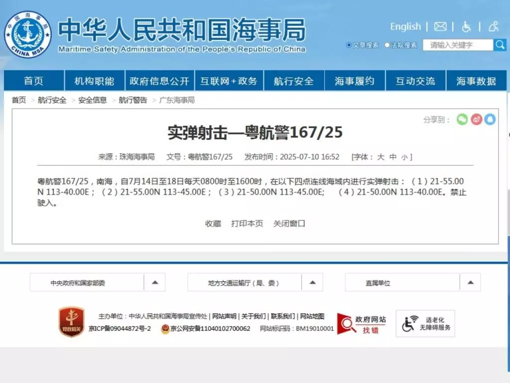 根據中國海事局網站消息,珠海海事局發布航行警告,本月14日至18日每天上午8時至下午4時,南海部分海域進行實彈射擊,禁止駛入。