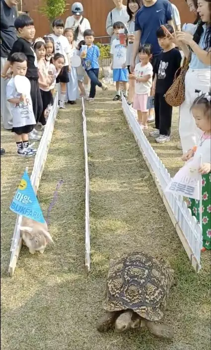 南韓農場舉辦現實版「龜兔賽跑」活動。影片截圖