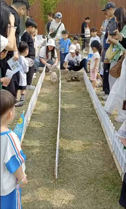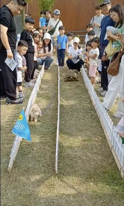 眾所週知,《伊索寓言》中的經典故事「龜兔賽跑」講述了善於奔跑的兔子因輕視對手,最終輸給穩健前行的烏龜。近日,南韓忠清南道洪城郡一間親子農場「托布克農場」(Tobuk Farm)舉辦別開生面的「龜兔賽跑」活動,由真兔子與烏龜一較高下,吸引了不少家長與小朋友到場觀賞。