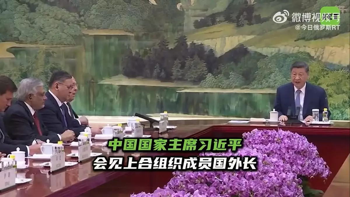 習近平在北京人民大會堂,集體會見來華出席上合組織成員國外長理事會會議的各國外長和常設機構負責人。央視截圖