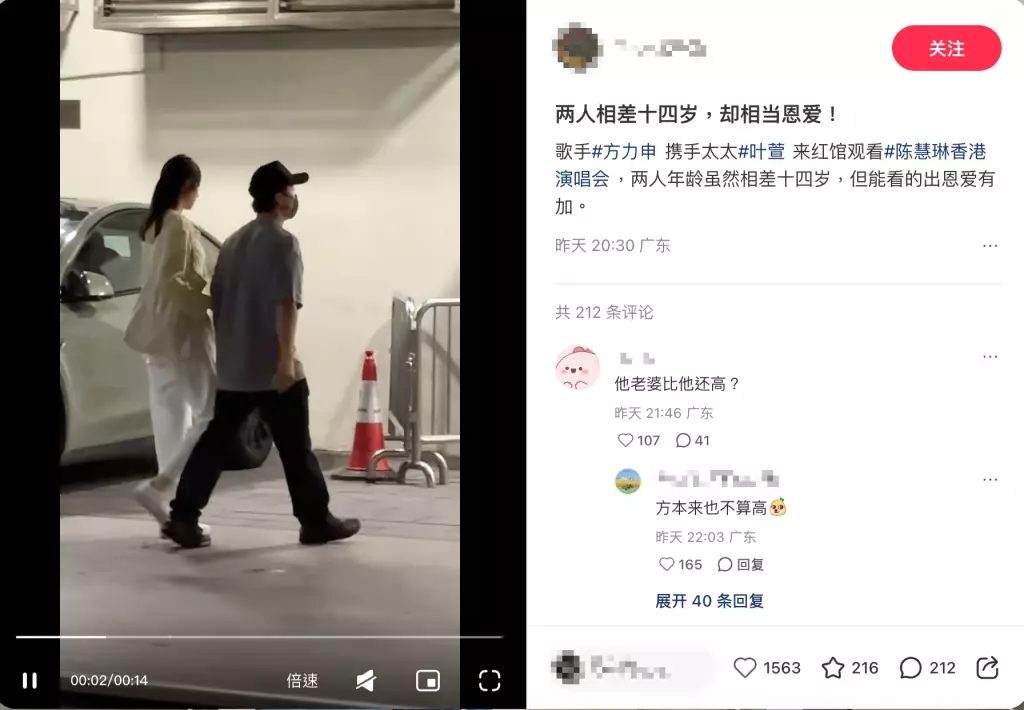 向來低調的葉萱鮮有出現在公眾面前,不過日前兩人就被網民拍到一同前往香港紅館欣賞陳慧琳演唱會。有網民將影片分享到小紅書,並寫道「兩人相差十四歲,卻相當恩愛!」,拍攝影片的網友指,「方力申攜手太太葉萱來紅館觀看陳慧琳香港演唱會,兩人年齡雖然相差十四歲,但能看的出恩愛有加。」