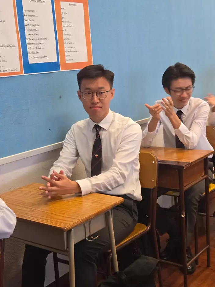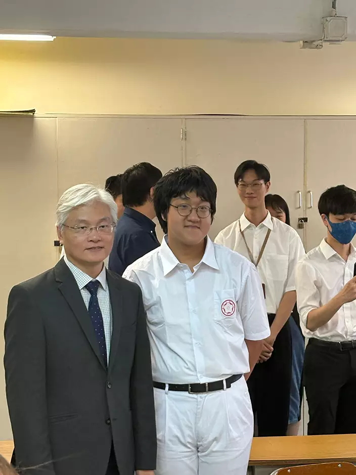 香港中國婦女會中學王海博同學(中)成為「終極狀元」。巴士的報記者攝