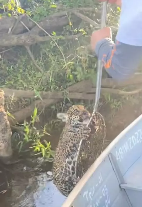 落水獲巴西漁夫救起 ,美洲豹BB緊抓漁網不放萌樣曝光。Tiktok截圖@vanderlei_rabi