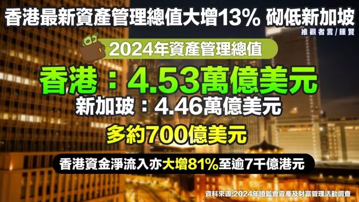 香港證監會《2024年資產及財富管理活動調查報告》正式出爐,香港在財富管理規模與資金流入等核心指標上,全面超越新加坡,重新確立其作為亞洲首選資產管理中心的地位。