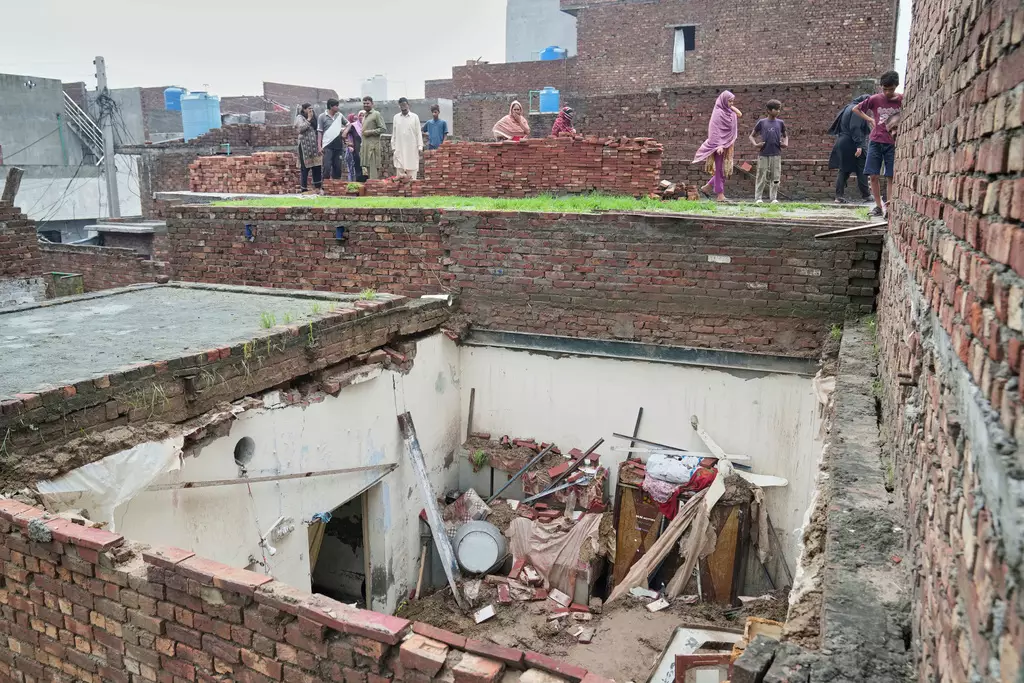 巴基斯坦拉合爾,當地居民看著因暴雨而倒塌的屋頂。AP圖片