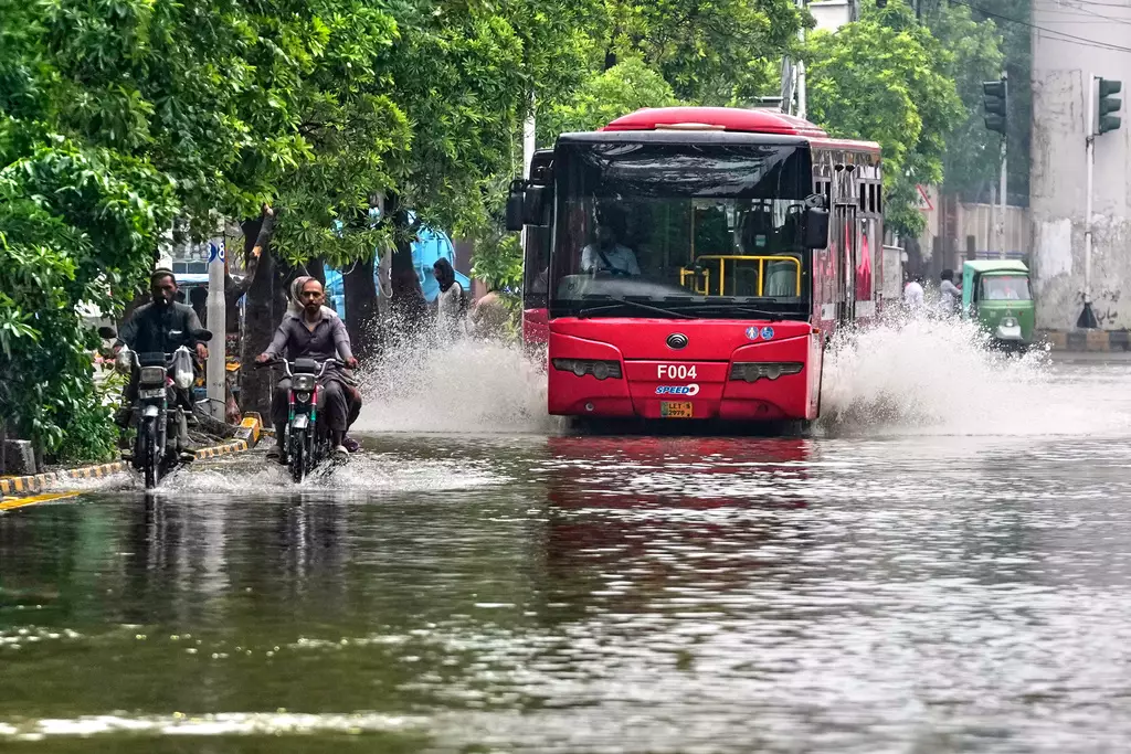 巴基斯坦拉合爾,車輛駛過因暴雨而被淹沒的道路。AP圖片