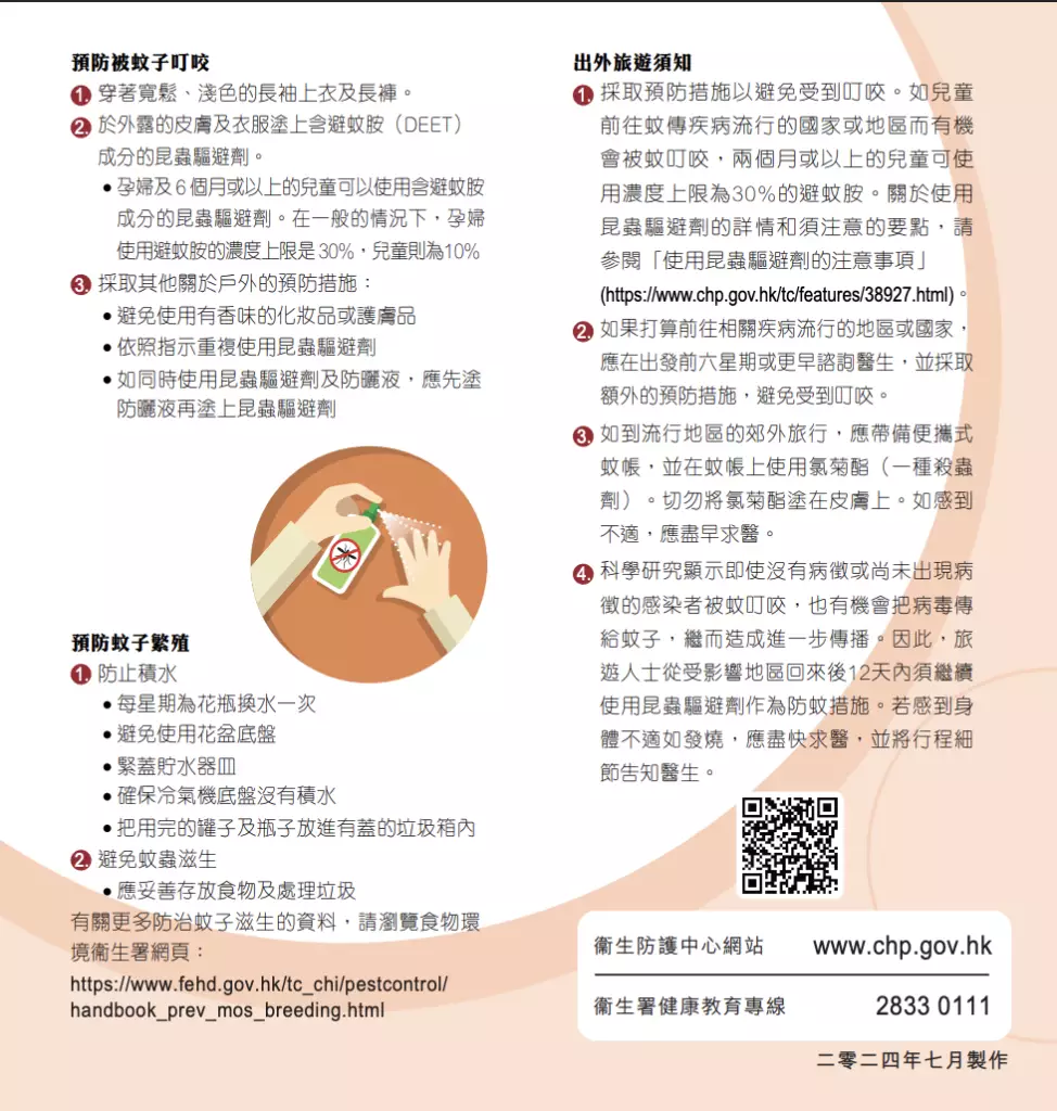 黃凱基提醒市民,炎熱多雨天氣下要做好防蚊措施,尤其到一些受蚊傳播疾病影響地區,要使用「蚊怕水」、穿著寬鬆和淺色衣服、防止積水等。如旅遊人士從受影響地區回港,14日內仍要繼續使用「蚊怕水」作為防蚊措施。他解釋說,如市民外遊期間受感染,回港後被白紋伊蚊叮咬後,蚊子可能受到感染,如再叮咬其他人,便有機會將病毒傳播。