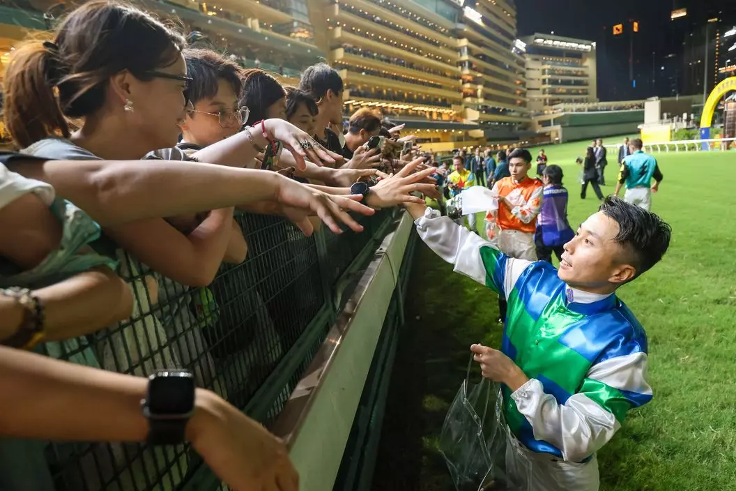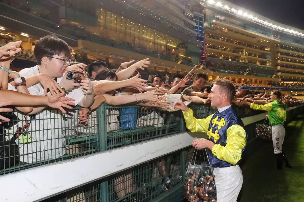 一眾騎師向場內馬迷致意,並派發紀念品,慶祝2024-2025馬季圓滿結束。香港賽馬會圖片