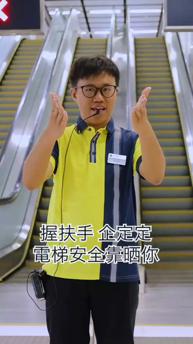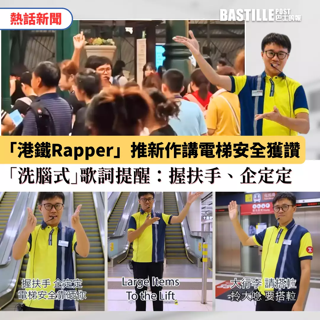 原來此名港鐵前線男職員Hinson,亦是紅磡站「站見」鐵路展導賞員,擁有豐富的鐵路歷史知識,被形容是「香港鐵路歷史活字典」。最近他推出新作品《握扶手、企定定 電梯安全靠晒你》,港鐵星期三(7月16日)在官方Instagram發布有關的新扶手電梯安全宣傳短片。片中Hinson以兩文三語歌詞,「洗腦式」提醒乘客要注意扶手電梯安全,片中的口號更是Hinson親自創作。