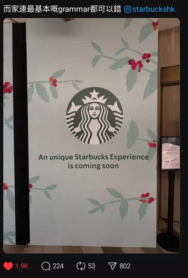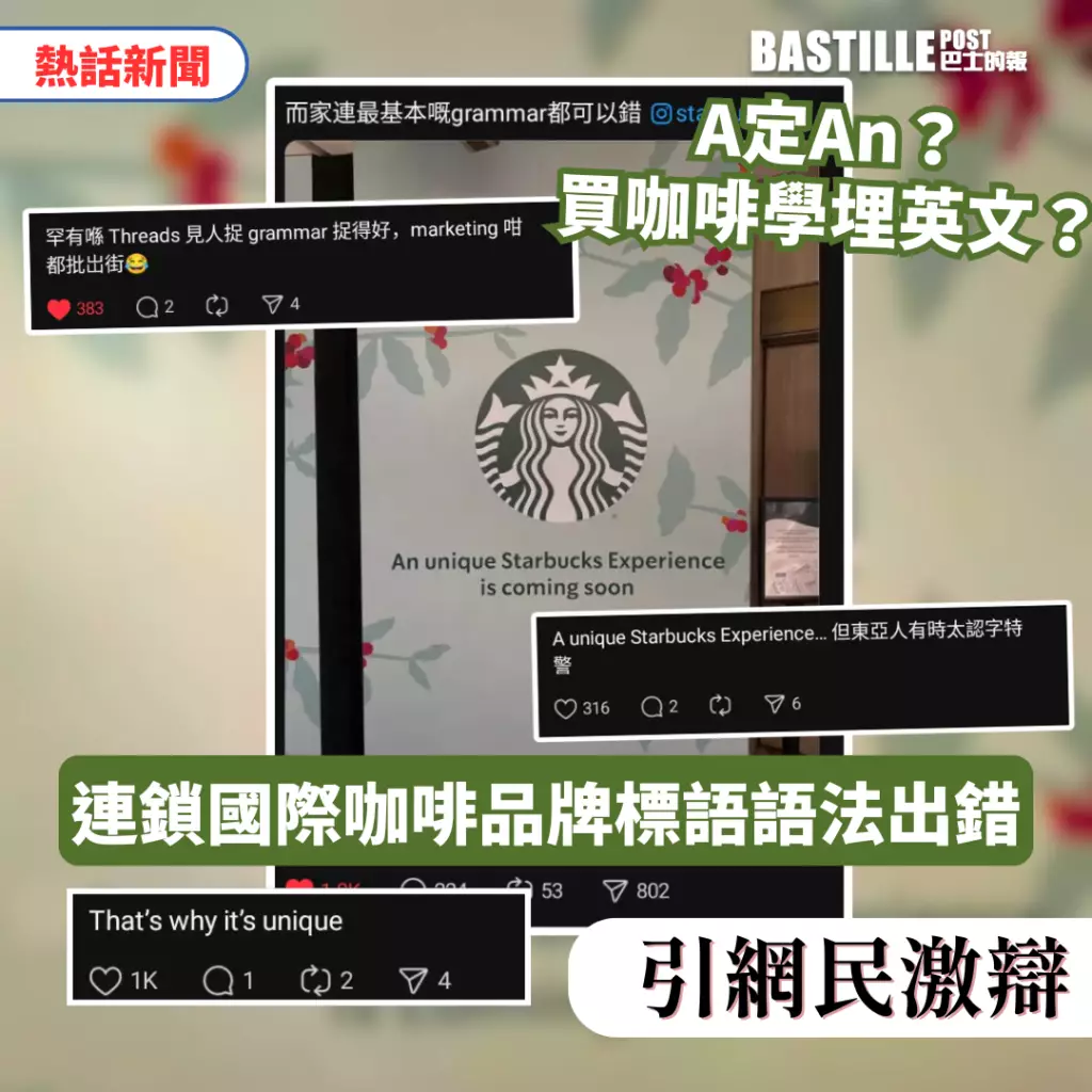 近日,有市民於社交媒體Threads上以圖文並茂方式開帖,指知名連鎖咖啡品牌Starbucks在本港某間分店的裝修圍版上,印有一則含基本語法錯誤標語,而引起網民熱烈討論。