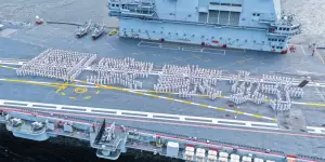 艦上人員在甲板上拼出 ‘國安家好’(網上新聞圖片)
