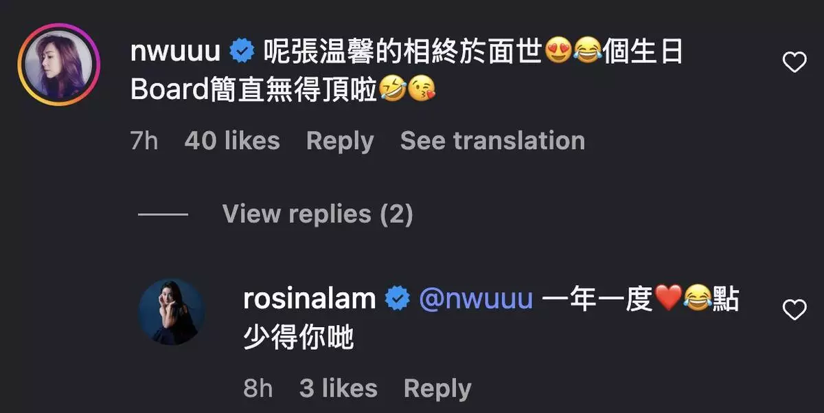 而胡定欣都有留言:「呢張温馨的相終於面世,個生日Board簡直無得頂啦!」林夏薇就回覆:「一年一度,點少得你哋!」可見她與好友們過了一個難忘的生日!