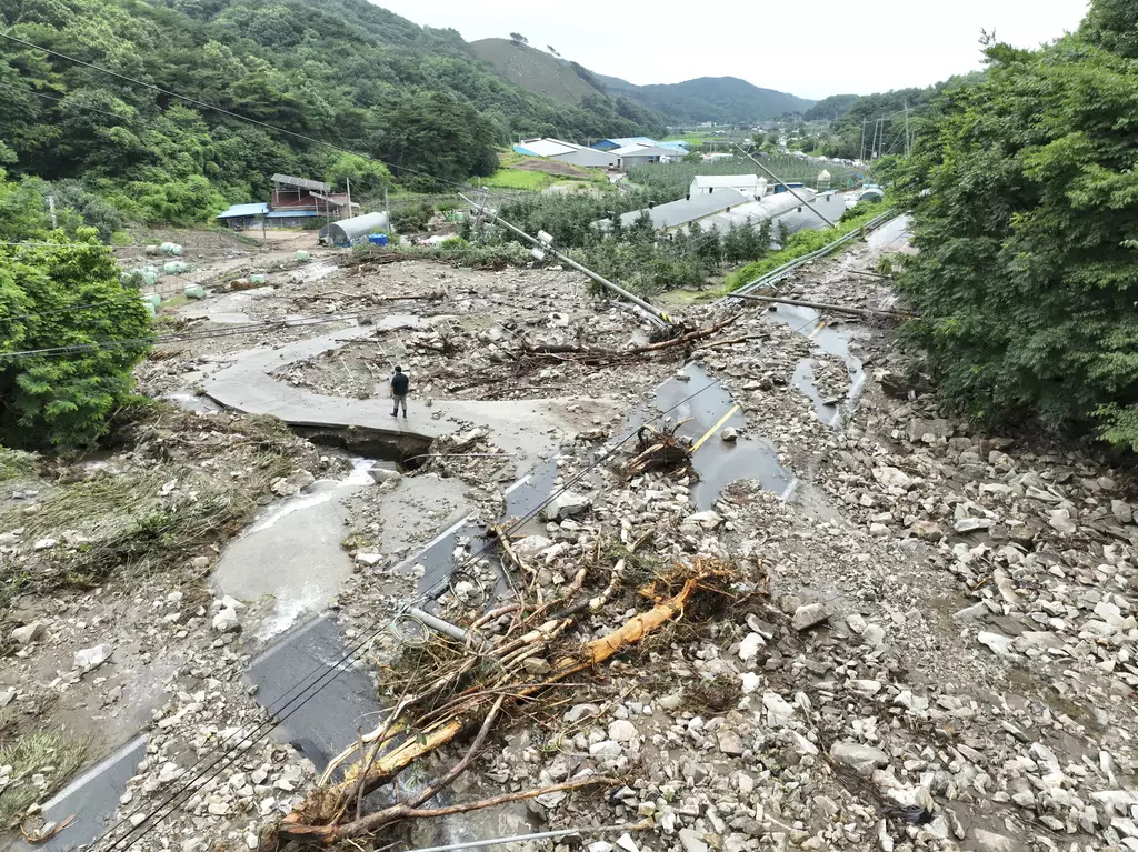 韓國禮山縣的一個村莊,因暴雨引發山泥傾瀉,道路被泥土和岩石覆蓋。AP圖片