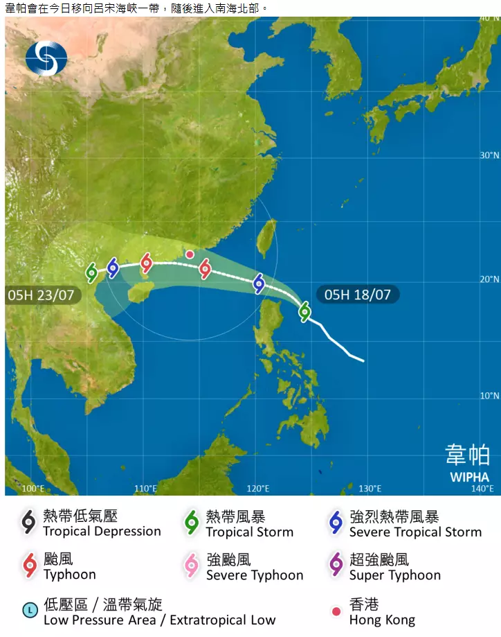 天文台表示在上午5時,熱帶風暴韋帕集結在馬尼拉之東北約480公里,預料向西北移動,時速約22公里,大致移向呂宋海峽一帶並逐漸增強。