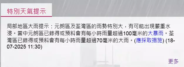 當中元朗區已錄得或預料會有每小時雨量超過100毫米的大暴雨,荃灣區已錄得或預料會有每小時雨量超過70毫米的大雨。