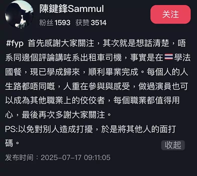 陳鍵鋒於帖文中闡明:「首先感謝大家關注,其次就是想話清楚,不是同哪個評論講了是出租車司機,事實是在三學法國餐,現已學成歸來,順利畢業完成。每個人的人生路都不同的,人重在參與與感受,做過演員也可以成為其他職業上的佼佼者,每個職業都值得用心,最後再次多謝大家關注。」
