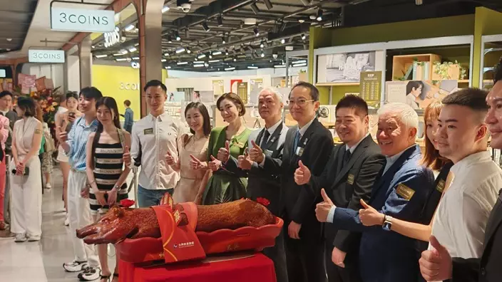 日本駐香港總領事館代理總領事西海茂洋(右六)、3COINS母公司株式會社PAL營業本部常務董事澤井克之(右五)、YAICHI 集團創始人及主席羅盛昌(左五)與嘉賓們進行切燒豬儀式。巴士的報記者攝