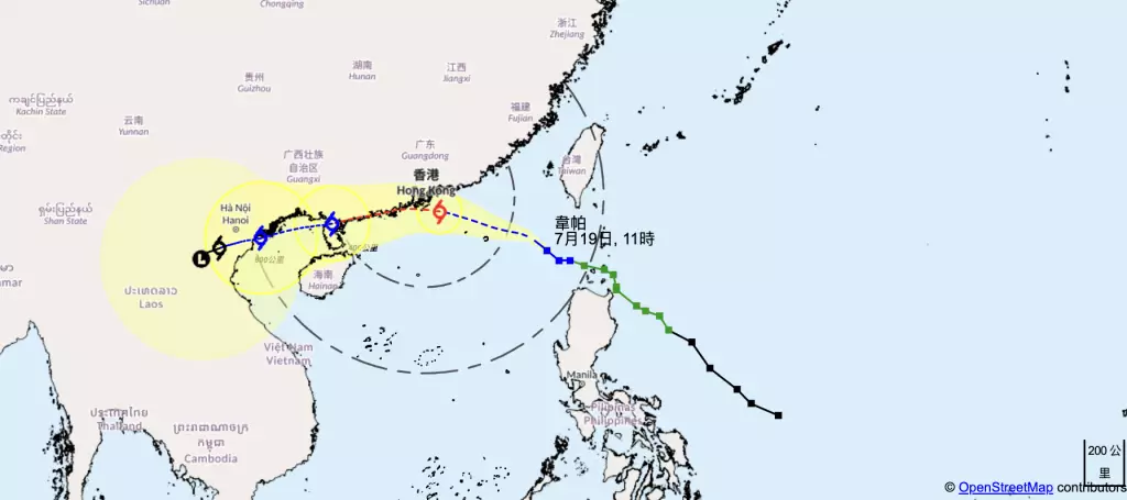韋帕會在星期日(7月20日)頗為接近珠江口一帶,本港會有頻密狂風大驟雨及雷暴。天文台會視乎韋帕與珠江口的距離、其強度及本地風力變化,考慮在星期日凌晨時分改發八號烈風或暴風信號。受風暴潮影響,沿岸低窪地區星期日早可能出現水浸。市民請密切留意天文台的最新天氣消息。