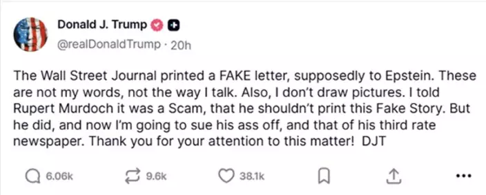 《華爾街日報》星期四(7月17日)報道,涉及性侵案的已故富商愛潑斯坦2003年50歲生日時,其女友馬克斯韋爾(Ghislaine Maxwell),為他準備的一份皮革裝生日紀念冊,收錄了數十人寄來的「露骨」信件,當中有美國總統特朗普寫署名信件,當中包含性暗示圖像及結尾寫上願每天是另一個美好的秘密。特朗普批評《華爾街日報》報道假新聞,揚言提出訴訟。據報他已入稟入稟邁亞密聯邦法院,起訴梅鐸、《華爾街日報》兩名記者、新聞集團及美國著名財經資訊出版公司杜瓊斯,索償至少100億美元。