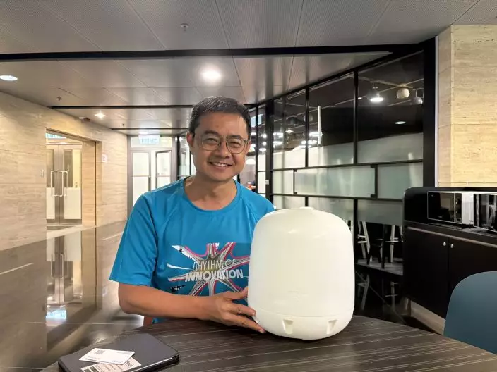 eSIX 行政總裁陳前與其公司OcéanoX生產線5G通信產品的合照,該產品運用在海洋水質監測、風力、漁船等不同方面。巴士的報記者攝