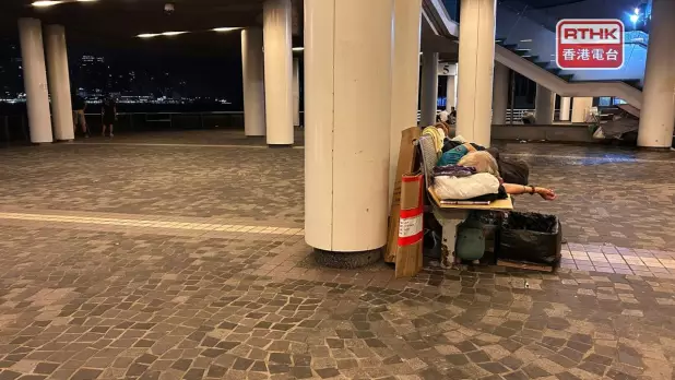 有露宿者在長櫈上睡覺。(林漢山攝)