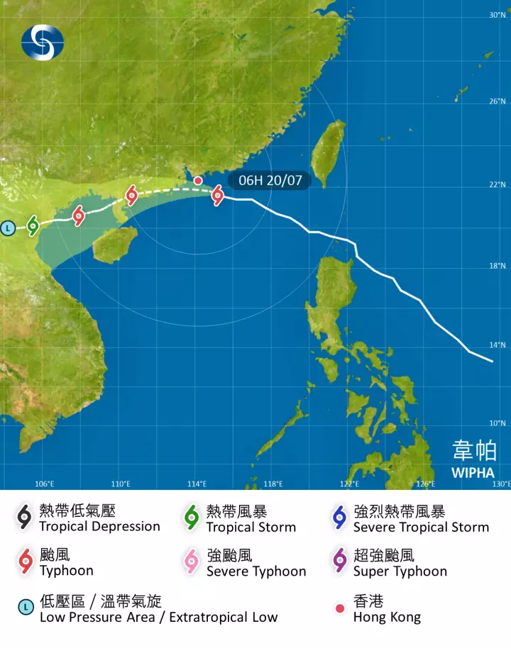 天文台指,過去數小時,颱風韋帕穩定地靠近珠江口一帶,本地風力正逐漸增強,高地正受烈風影響。按照現時預測路徑,韋帕會於今日(7月20日)接近中午在香港天文台以南約50公里左右掠過,預計其颶風區會相當接近本港,本地風勢將進一步增強。天文台會在今早7時20分改發九號烈風或暴風風力增強信號。市民請密切留意天文台的最新天氣消息,並完成所有預防措施。