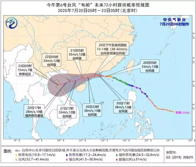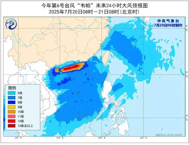 中央氣象台預計韋帕周日下午至夜間以颱風或強颱風級別,在廣東珠海到湛江一帶沿海登陸。中央氣象台圖片